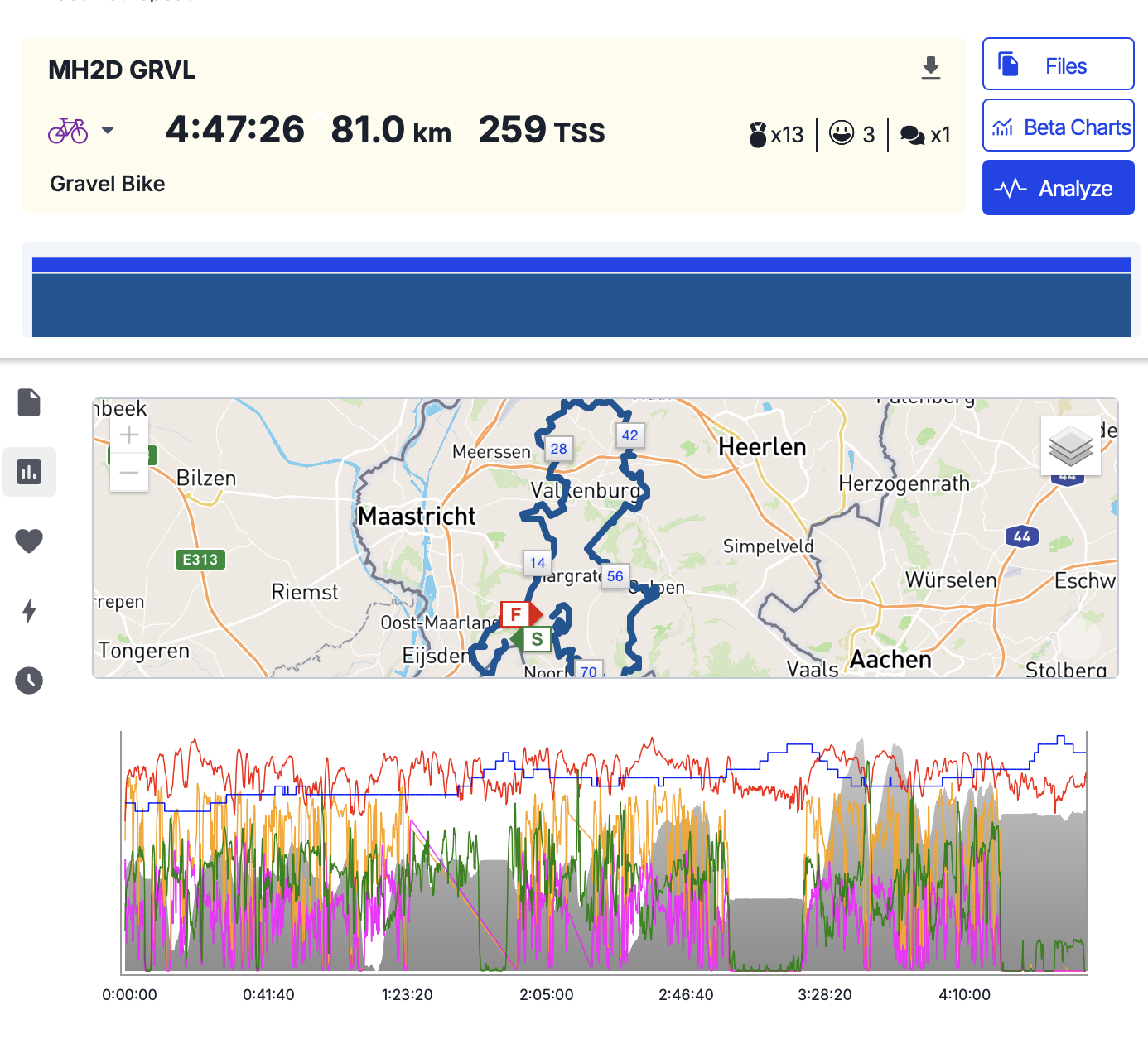 Vrijdag ben ik met de trein aangekomen en vanaf station Maastricht naar de camping in Noorbeek gefietst. De gravelbike bepakt met tent en alle overnachtingsspullen. Op dezelfde camping stonden Rick en Jeanet ook met de camper. Rick fietste dit weekend op de racefiets en Jeanet is gaan wandelen. Met hen heb ik het weekend opgetrokken. Ik kreeg elke ochtend een heerlijk ontbijt voorgeschoteld! Vrijdagavond hebben we een pizza gegeten in Hoeve Cobelli, waar we normaal met de groep verblijven, dus bekend terrein. Zaterdag heb ik de gravelroute door Zuid-Limburg en een stukje door België gefietst met heerlijk weer. Helaas kreeg ik wel twee lekke banden: direkt 3 kilometer na de start en 2 kilometer voor de finish. De eerste lekke band herstelde zichzelf (tubeless) en de tweede lekke band had een te groot gat. Gelukkig was er een fietsenzaak in de buurt en daar heb ik een binnenband erom laten zetten. En met de nieuwe band heb ik de laatste 2 kilometer uitgefietst. Met Rick en Jeanet heb ik ‘s avonds in het restaurant op de camping gegeten. Van zaterdag op zondag is het flink gaan regenen, waardoor ik zondag niet meer ben gaan fietsen. Anders had ik nogmaals een route van 80 km. gefietst, maar het was me te glad en modderig. Met de trein weer huiswaarts gegaan.